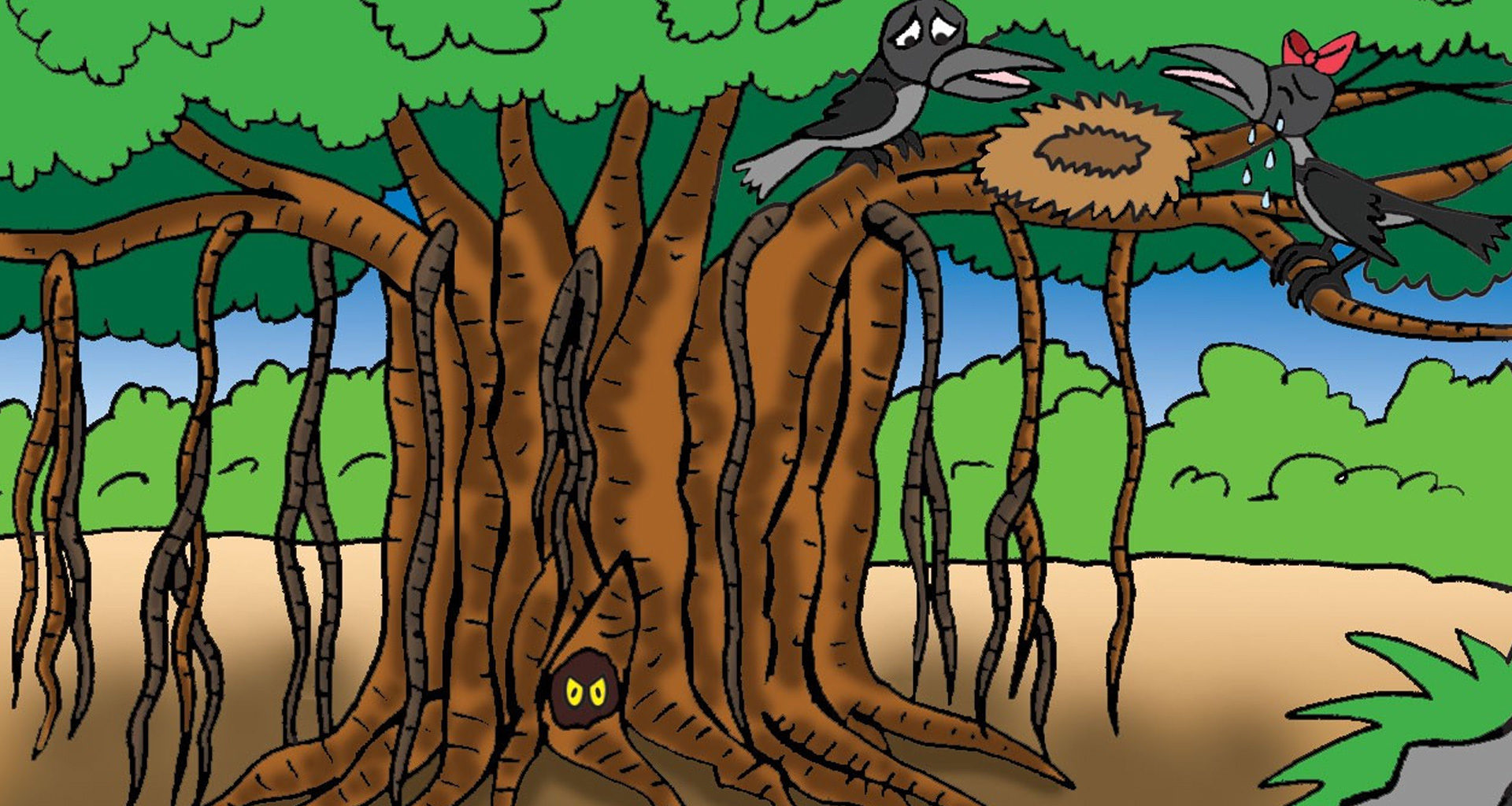 A pair of crows built a nest on the branch of a beautiful banyan tree and laid eggs. A serpent living at the base of the tree gobbled up some of the eggs. Did the crows run away?
