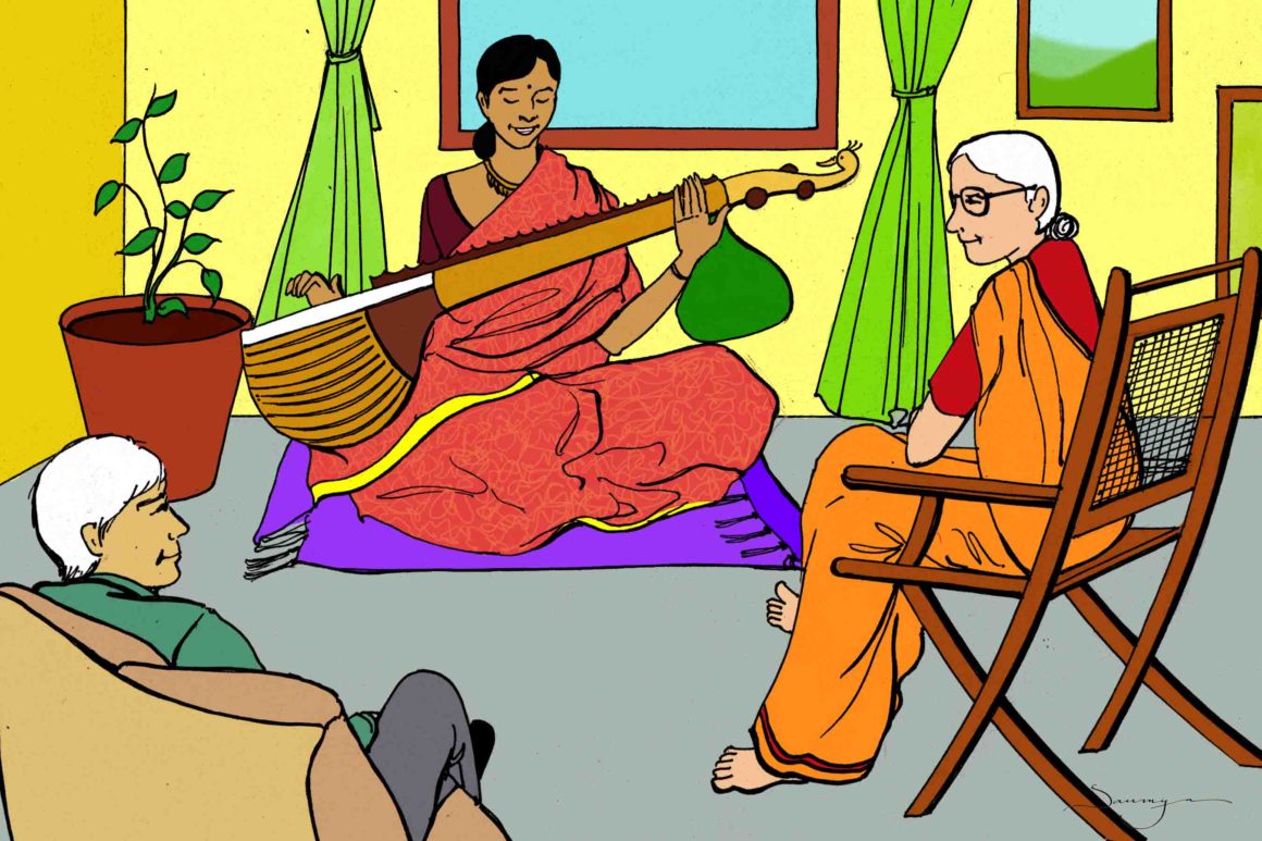 The couple then paid a visit to the second daughter-in-law. They found her sitting in her room which appeared empty. She was singing a song. Her voice was so melodious that the old couple entered the room and sat there listening to her song.