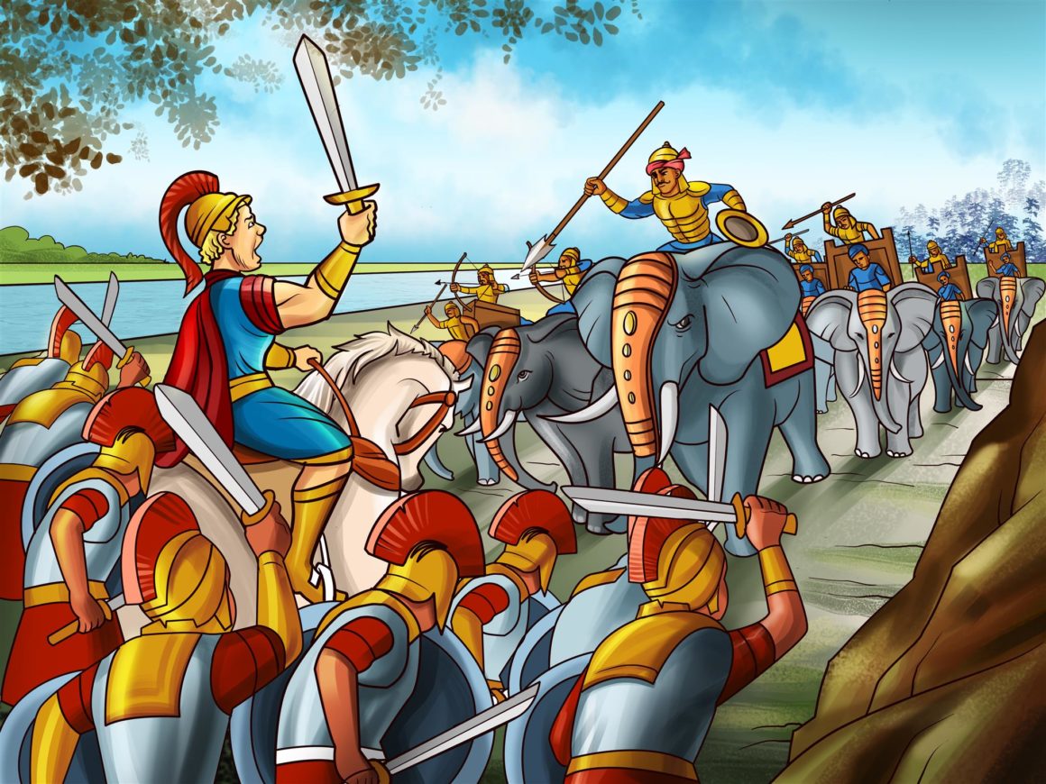 King Paurava, also known as Porus, ruled the region between the rivers Jhelum and Chenab in North India. One day a messenger arrived in his court. He had a fair skin and spoke a foreign language. His message was simple: Submit to King Alexander or be ready for war.