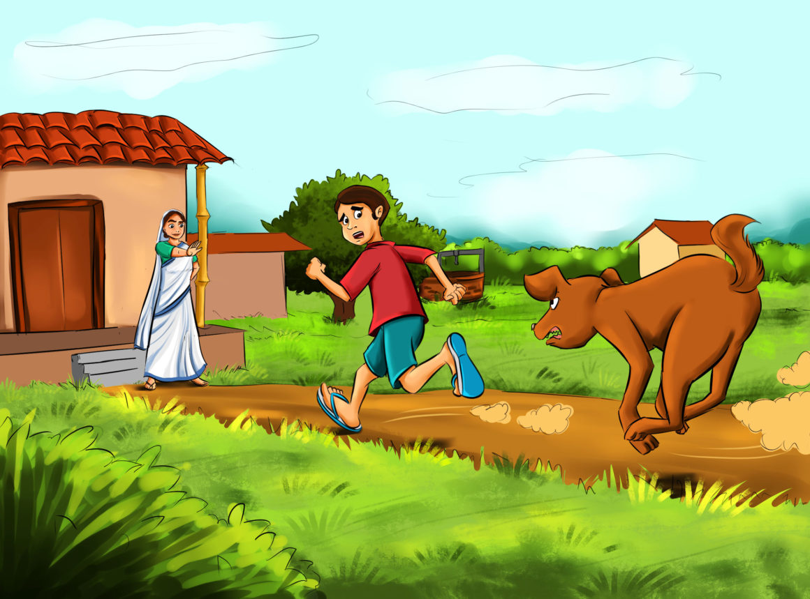 Little Jatin was afraid of stray dogs. One evening, when a street dog barked at him, he turned and started running. The dog ran after him barking loudly. The only safe place, Jatin thought, was home. He ran even faster.