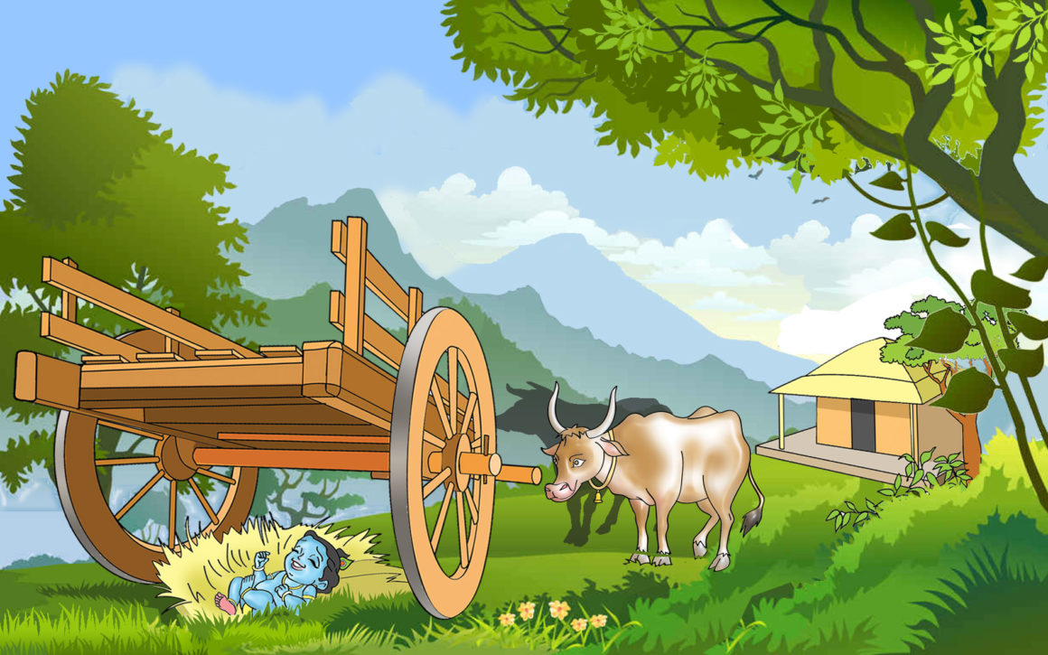 The ladies were busy with the ceremony. Baby Krishna was put in a cradle as the ladies sang lullabies. Little Krishna moved his hands and legs in delight. Soon, he fell asleep. Yashoda looked for a place where her child would not be disturbed as he slept peacefully. The house was full of giggling girls and gossiping women. Yashoda spotted a quiet place — the courtyard. She placed the cradle with the sleeping Krishna below the decorated hand cart parked in the courtyard. Little did she know that a demon was lying low, right there in the cart!